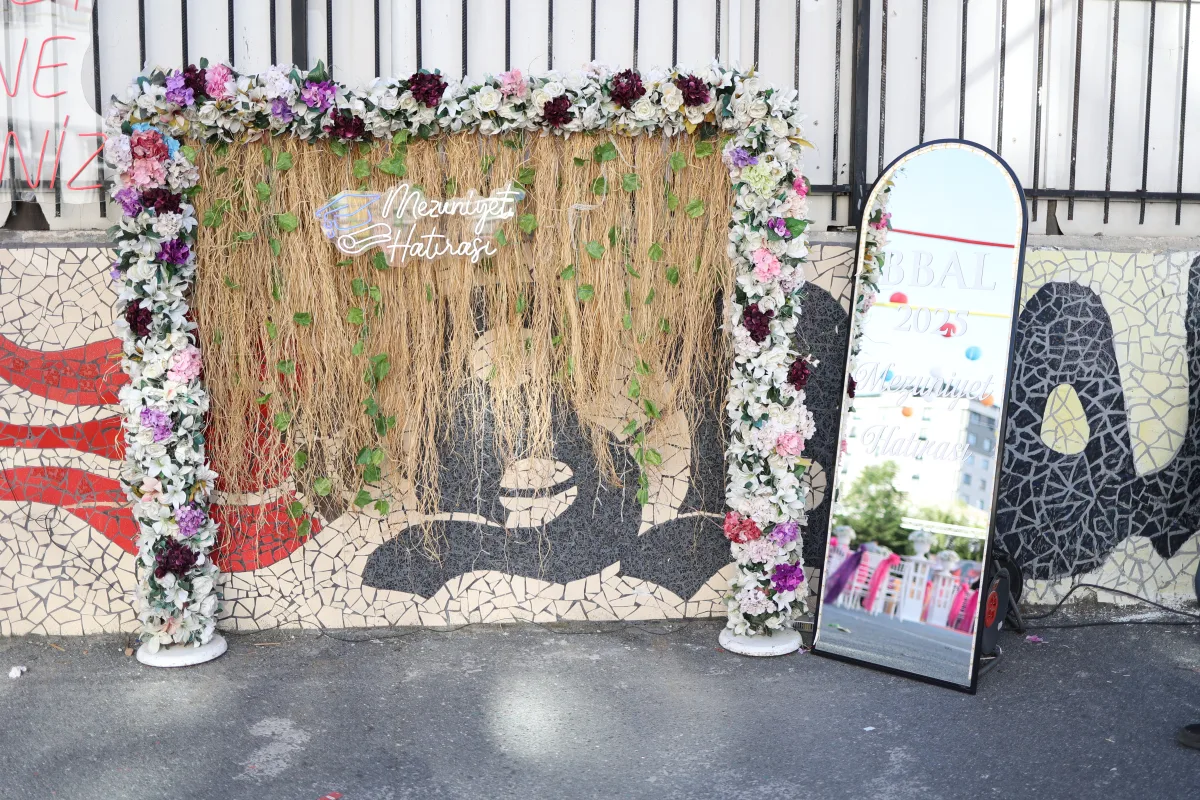 Okul logosu ve “Class of 2026” yazılı, derinlik algısı yaratan 3D panolarımızla sıradan fotoğraf duvarlarını geride bırakıyoruz.